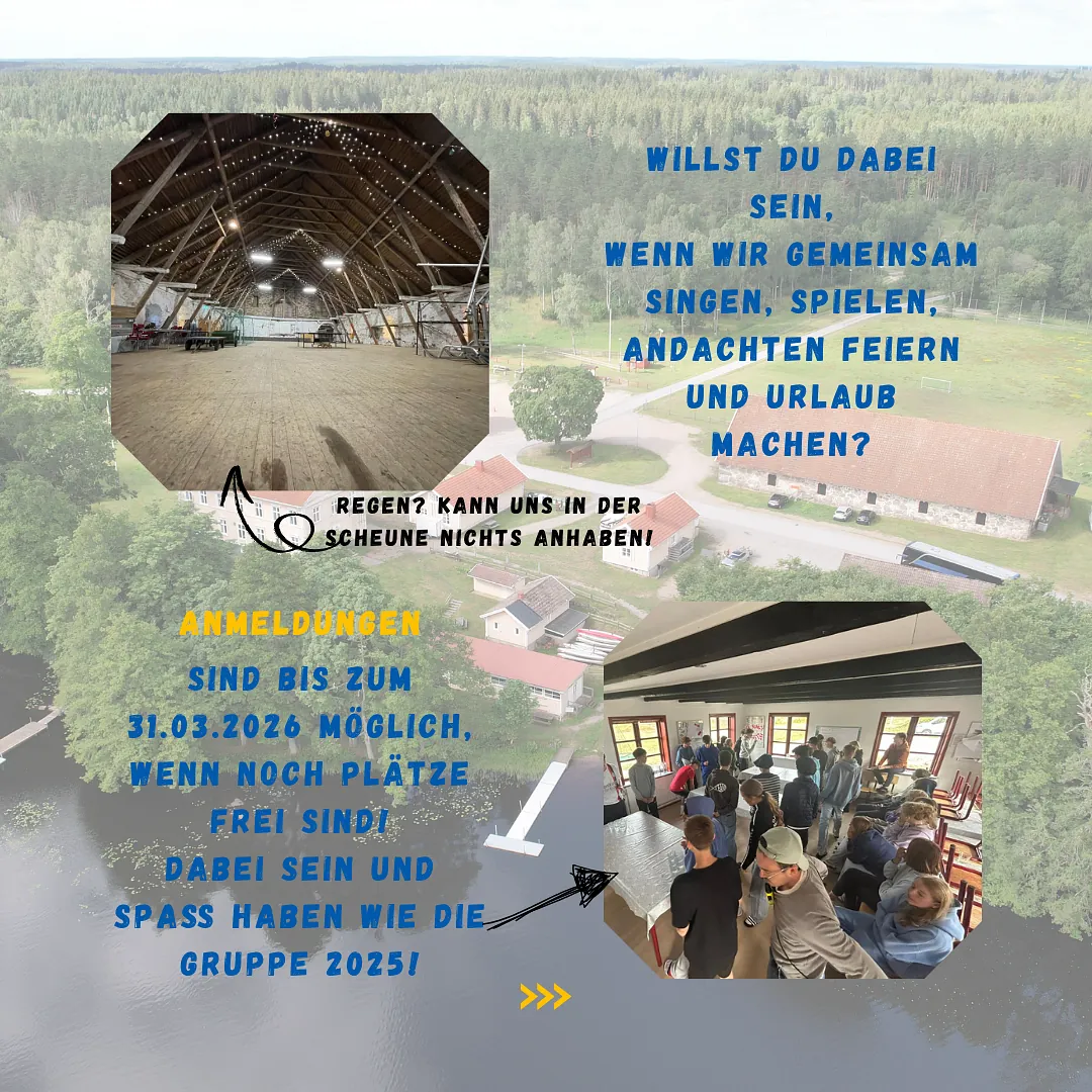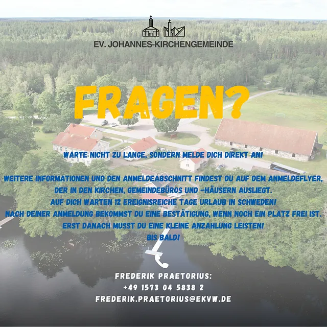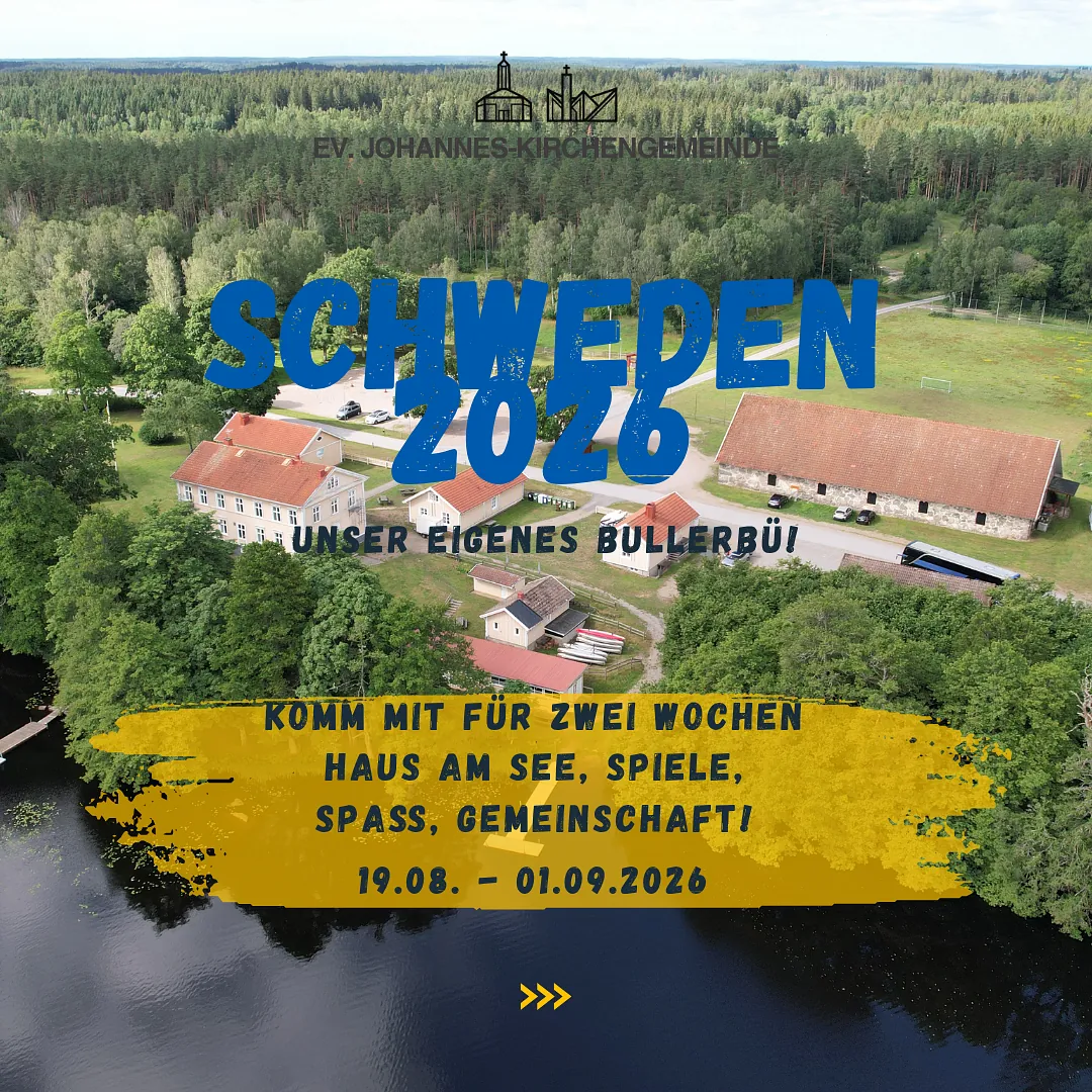 Die Evangelische Johannes-Kirchengemeinde bietet auch in diesem Jahr eine Freizeit für Jugendliche zwischen 13 und 16 Jahren an. Die Gruppe fährt in diesem Jahr zwischen dem 19.08.2026 und dem 01.09.2026 in ein eigenes kleines Bullerbü - Haus und Hof direkt am See! Urlaub mit Kanus, Fahrrädern, viel coolem und abwechslungsreichem Programm und einer Gruppe, die einfach Spaß hat!